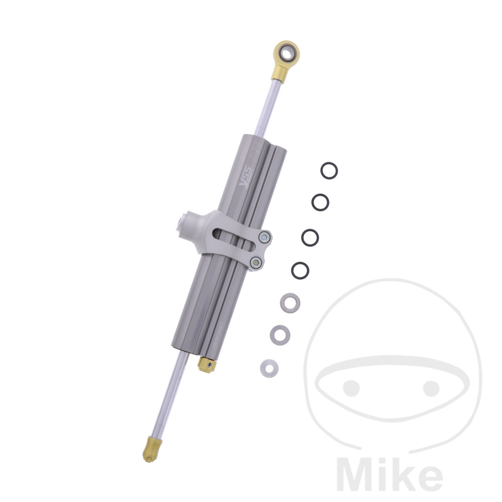 Amortisseur de direction de course en YSS anodisé platine.Réglable en 30 clics. Course de 120mm. Support de fixation pour fixation verticale à la moto.La livraison comprend 2 manchons de montage de 6 mm à réduire.Boulon de fixation: 8mm pour pince et bras amortisseur.Les amortisseurs de direction Racing ont un réglage plus progressif que les amortisseurs de direction Top Line.