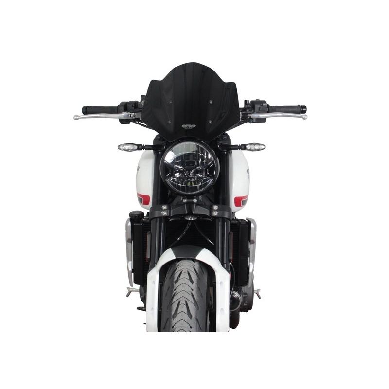 Le pare-brise sport de 30 cm de long (NSPM) de MRA augmente sensiblement le confort de conduite en soulageant le pilote de la pression du vent. Le Trident – à mi-chemin entre le moderne et le classique – sera adapté à une utilisation quotidienne avec le pare-brise sport qui, dans les différentes couleurs (incolore, gris fumé, noir) et avec sa découpe ronde inférieure, s’adapte très bien au phare rond. Le matériel de montage et les instructions sont inclus dans la livraison.