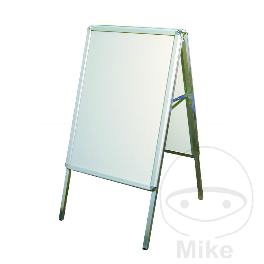 Composé d’un support pliable en tube carré d’aluminium et de deux cadres de serrage montés anodisés argentés, composés de profils de serrage en aluminium de 32 mm de large et de coins Rondo chromés brillants qui permettent un changement d’affiche rapide en quelques secondes.