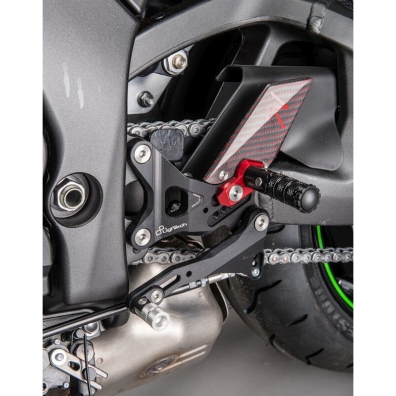 Le système de repose-pieds réglables avec repose-pieds rabattables se présente comme un élément technologique exceptionnel pour les motocyclistes. Fabriqué en aluminium aéronautique à haute résistance, il associe une construction légère de premier ordre à un design italien exclusif. Le système de repose-pieds peut être réglé à la fois vers le haut et vers l’arrière, ce qui permet au conducteur de l’adapter à ses préférences ergonomiques.