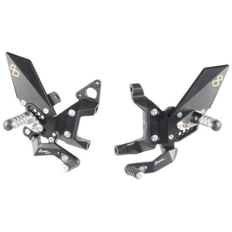 Le système de repose-pieds réglables avec repose-pieds rabattables se présente comme un élément technologique exceptionnel pour les motocyclistes. Fabriqué en aluminium aéronautique à haute résistance, il associe une construction légère de premier ordre à un design italien exclusif. Le système de repose-pieds peut être réglé à la fois vers le haut et vers l’arrière, ce qui permet au conducteur de l’adapter à ses préférences ergonomiques.