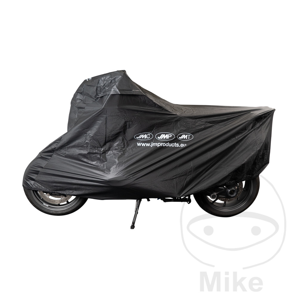 Avec un élastique sur la roue avant et arrière, ainsi qu’une fermeture à clic, qui se ferme sous la moto.