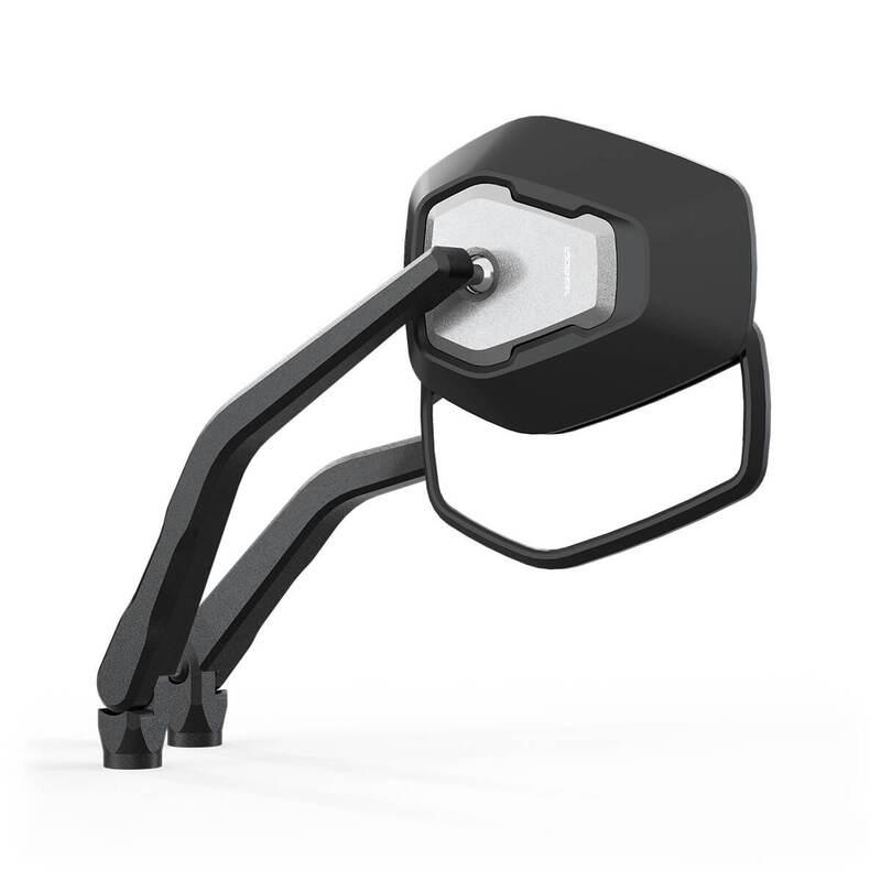 Les trapèzes ascendants et plats créent le design futuriste de la série de rétroviseurs HIGHSIDER ESAGANO-RS, qui reprend ainsi le langage des formes des motos modernes. Le corps de base de la tête du miroir, fabriqué en plastique de haute qualité, entoure l’inlay marquant, fabriqué en aluminium CNC. Celui-ci symbolise le langage des formes de la famille de produits ESAGANO et crée une valeur d’identification unique avec ses géométries montantes et descendantes. La surface grenaillée et anodisée en noir mat de l’aluminium se détache de la surface de la tête du miroir et parachève l’image. Le manche en aluminium permet, grâce à son coude et à sa taille, une large exposition de la tête du miroir, ce qui permet une rétrovision particulièrement bonne. En même temps, grâce à sa forme, il offre suffisamment de place entre la zone de préhension et le manche du miroir.