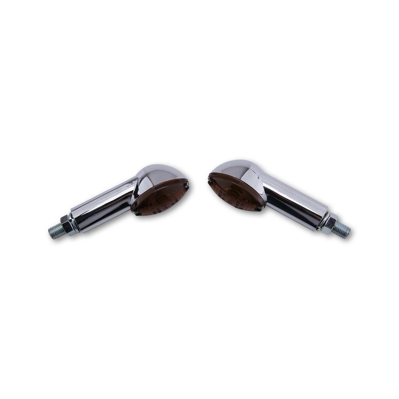 SHIN YO Mini clignotant Cat Eye Petit clignotant halogène avec boîtier plastique noir et verre teinté, marquage E. Dimensions : A : 45 mm B : 85 mm D : 25 mm Longueur de la poignée : 40 mm Vis filetée : M10 Lampe : 12V 21W BAY9S Ampoule halogène