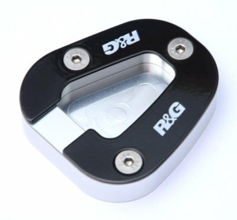 Le patin de béquille latérale R&G permet de doubler la surface au sol de la plateforme de la béquille, et est prévu pour un montage permanent. Il permet de renforcer la stabilité de la moto béquillée, notamment sur terrains non stabilisés.