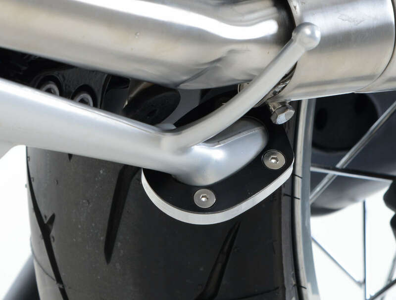 Les patins de béquille R&G Racing se vissent sur votre béquille d’origine et doublent la surface d’appui, pour éviter l’enfoncement dans le sol. Malgré sa taille plus importante, la garde au sol et la ligne de chaine ne sont pas affectées dans des conditions normales de conduite.