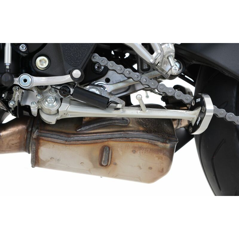 Le patin de béquille latérale R&G permet de doubler la surface au sol de la plateforme de la béquille, et est prévu pour un montage permanent. Il permet de renforcer la stabilité de la moto béquillée, notamment sur terrains non stabilisés.