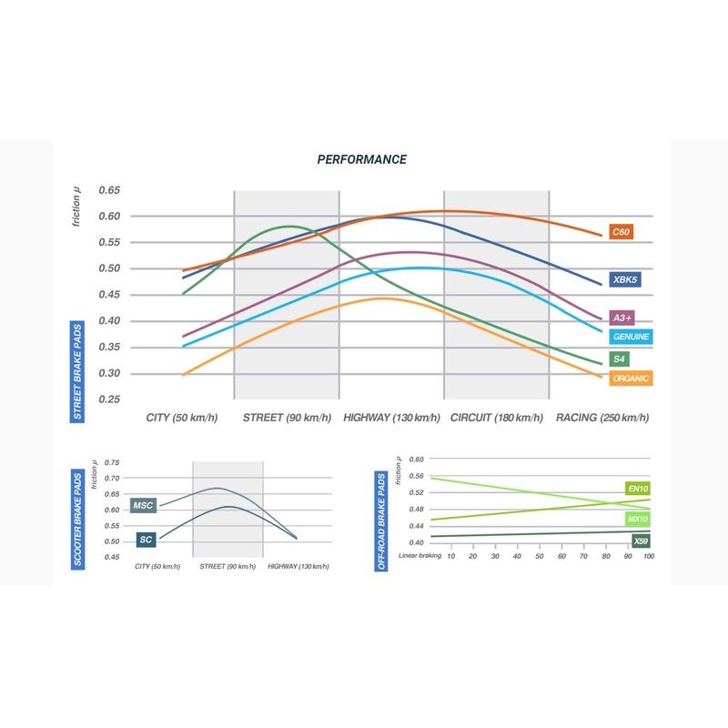 Excellente proportionnalité entre effort à la poignée et puissance de freinage. Utilisation pour usage routier, sportif et compétition. Très faible usure des disques et des plaquettes.