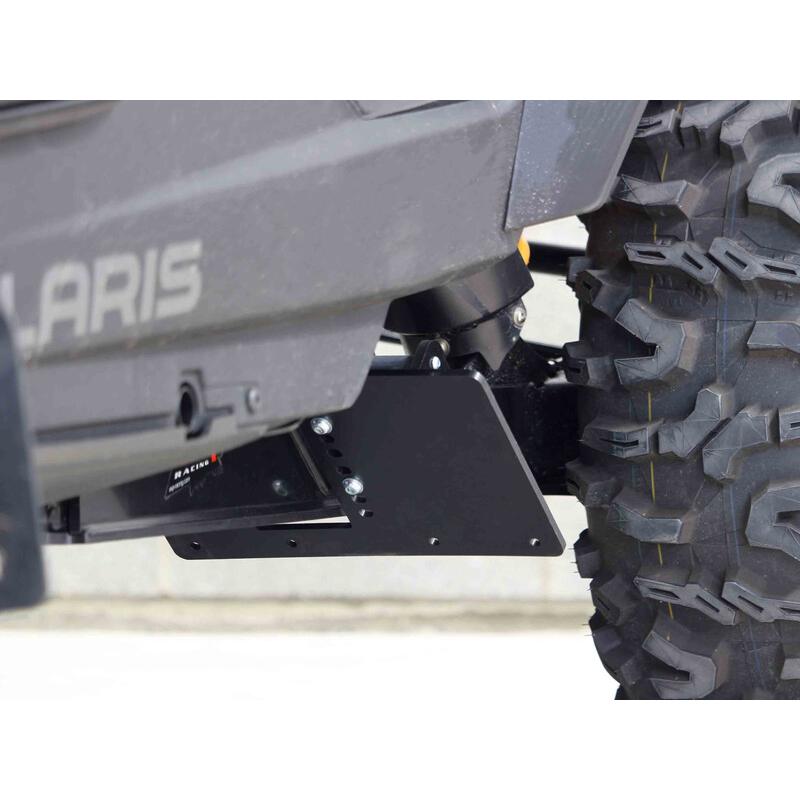 Ces protections sont un assemblage soudé de pièces en PEHD d’épaisseur 8mm qui enveloppent complètement les bras arrière. Une plaque ajustable en hauteur limite les projections venant des roues avant afin de protéger les composants intérieurs des roues arrières. Elle peut également accueillir une bavette en caoutchouc si besoin.