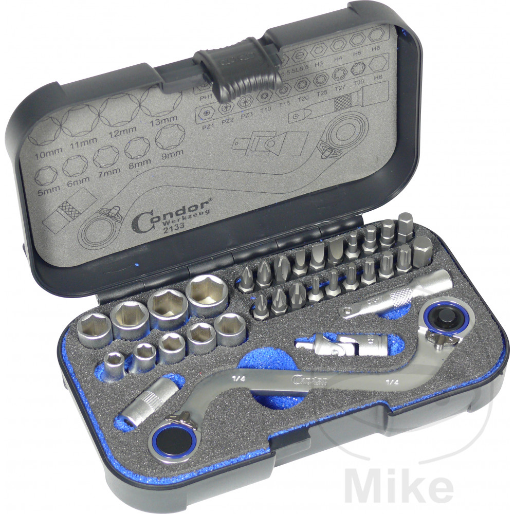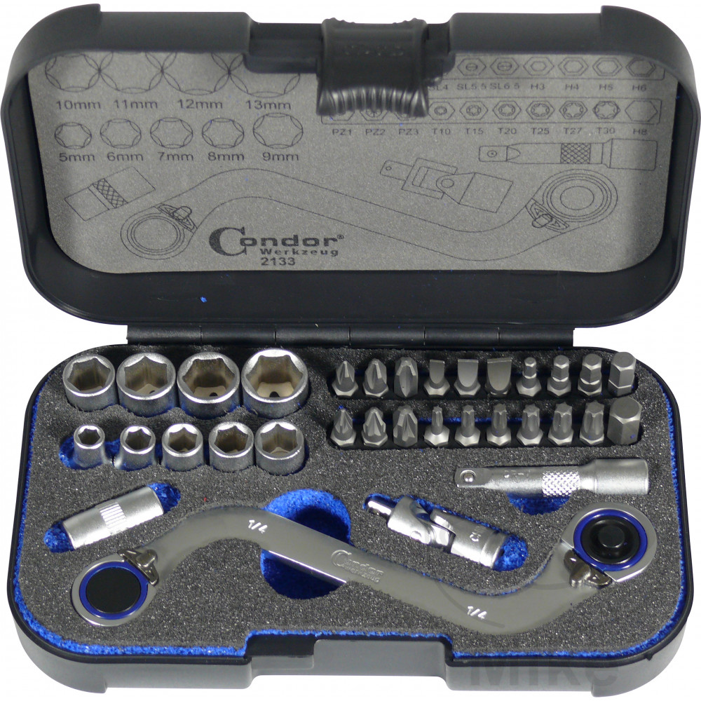 – 1 douille 1/4″ (6,3 mm) en 5, 6, 7, 8, 9, 10, 11, 12 et 13 mm