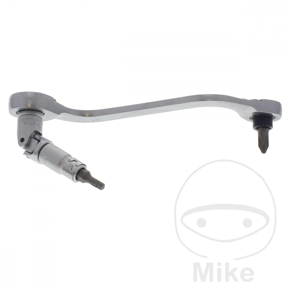 La clé à cliquet de type S est dotée d’un entraînement hexagonal pour embouts et d’un entraînement quadrangulaire pour douilles avec blocage de l’insert (tous deux 1/4″ / 6,3 mm), d’une denture fine (72 dents) et d’une inversion gauche / droite.