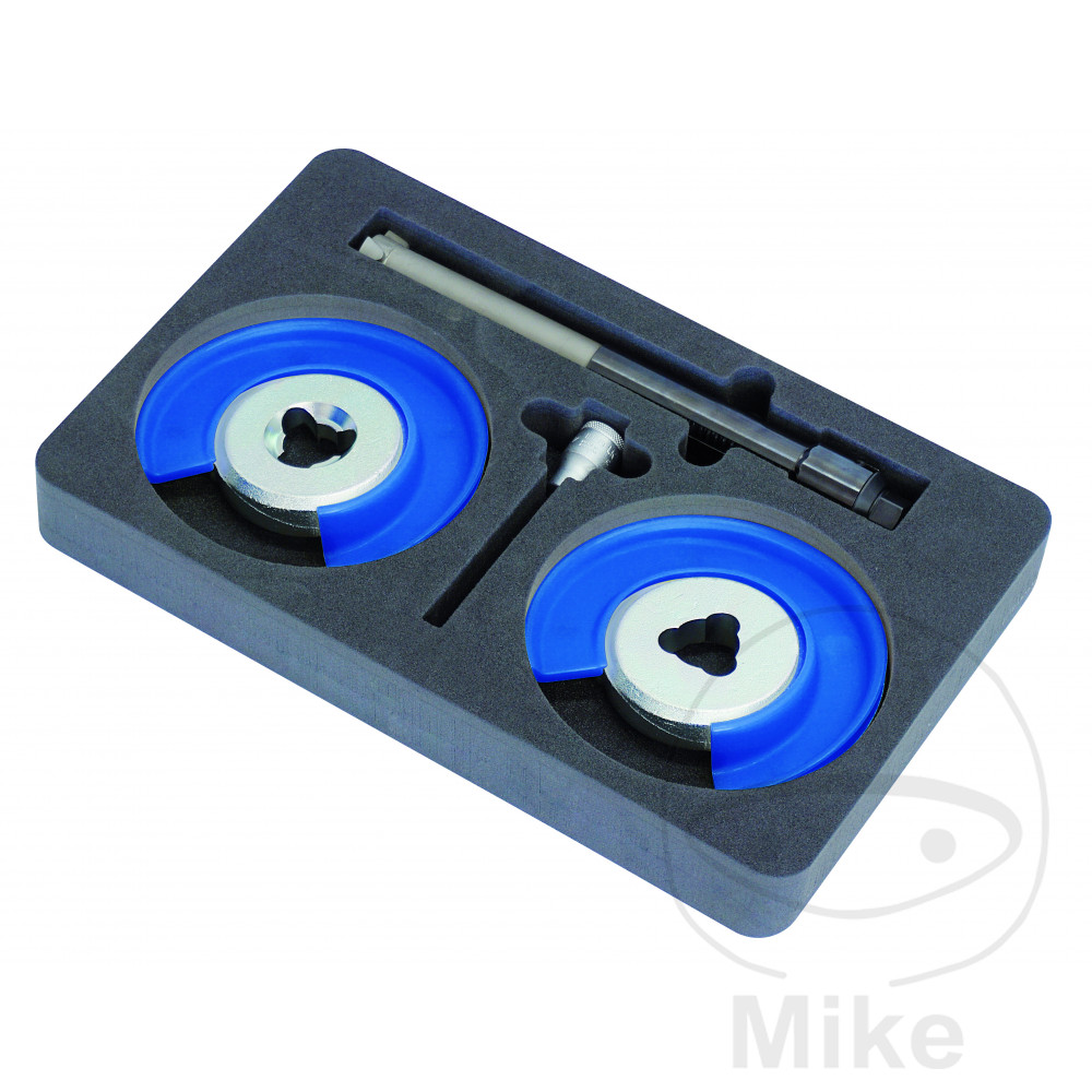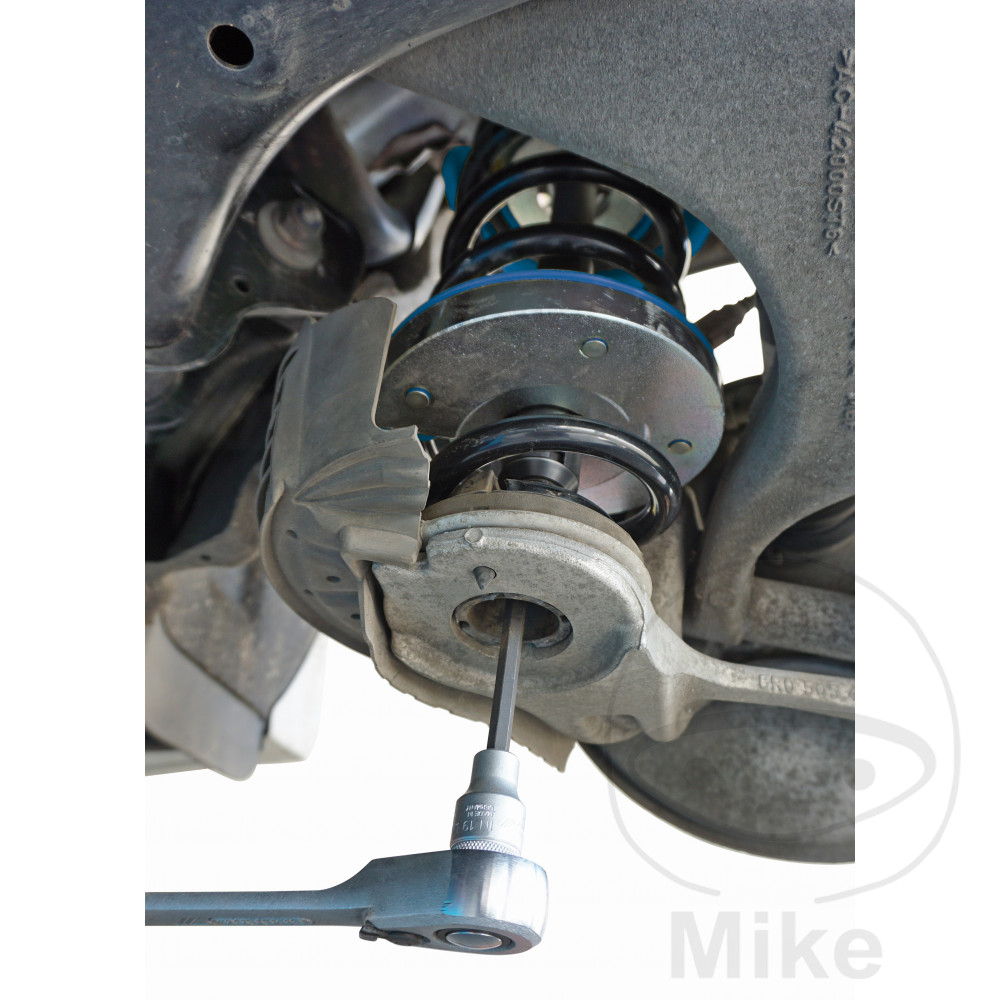 La construction particulièrement compacte du tendeur de ressort intérieur permet, par exemple sur les véhicules VAG avec un très petit trou de passage (env. Ø 34 mm) en bas du bras oscillant transversal, une insertion simple du cylindre de serrage à travers le bras oscillant transversal et rend ainsi superflu le desserrage de divers composants de l’essieu ainsi que la mesure de l’essieu qui en résulte.