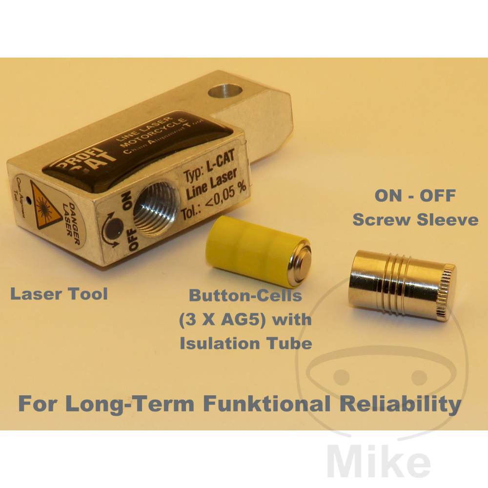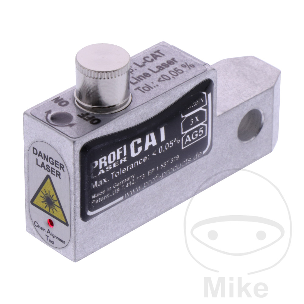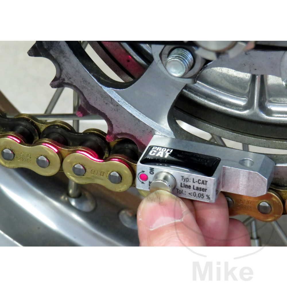 Les erreurs d’application sont pratiquement exclues.L’alignement de la chaîne est réglé en quelques secondes à l’aide de l’appareil de test précis. Il suffit de vérifier si la ligne lumineuse éclaire la même distance par rapport au bord de la chaîne sur toute la longueur de celle-ci.Le réglage précis de la roue arrière garantit une conduite optimale.